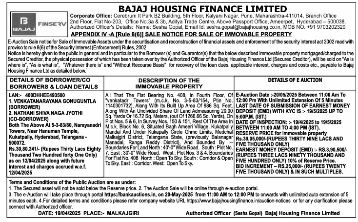 | Schedule of Property: | All That The Flat Bearing No. 408, In Fourth Floor, Of venkatadri Towers (m.c.k. No. 3-5-83/154, Ptin No 1140301732), Along With Its Built Up Area Of 986 Sq. Feet Along With An Undivided Share Of Land Admeasuring 20.00 Sq. Yards Or 16.72 Sq. Meters, (out Of 1266.66 Sq. Yards), On Plot Nos. 6, In Survey Nos. 150 & 151, Rest Of The Area In M.c.k. Block No. 6, Situated Bagh Ameeri Village, Kukatpally Mandal And Under Kukapally Circle Ghmc Limits, Medchal Malkajgiri District, Telangana State, (previously Balanagar Mandal, Ranga Reddy District), And Bounded By Boundaries For Land North 40'-0" Wide Road. South: Plot No. 7. East 30'-0" Wide Road. West: Plot Nos. 3 & 4. Boundaries For Flat No. 408 North Open To Sky. South Corridor & Open To Sky. East Corridor. West: Open To Sky. |