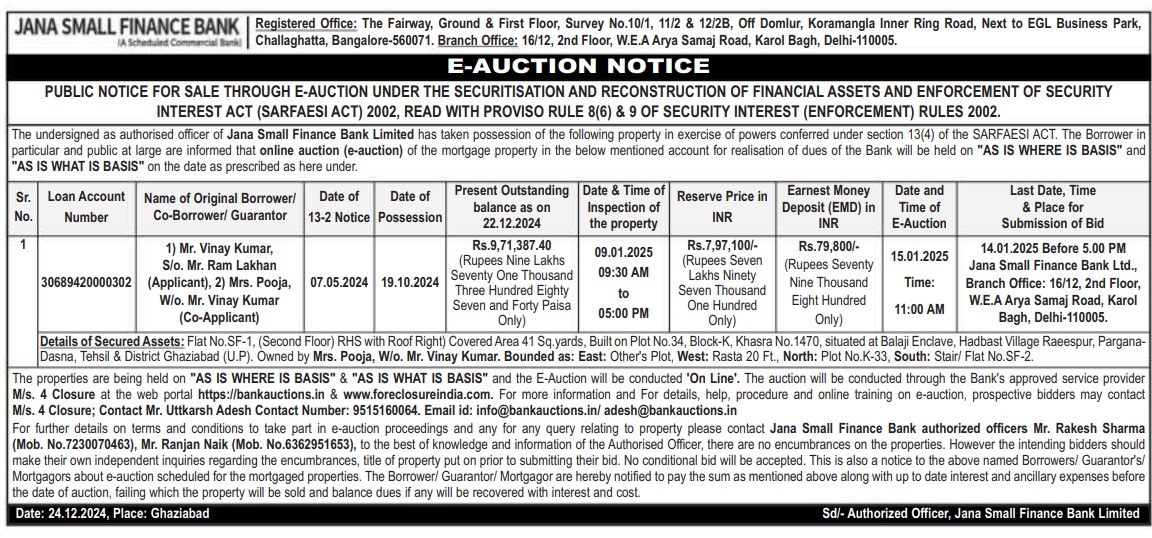 | Start Date and Time of Auction: | 15-01-2025 11:00 am |