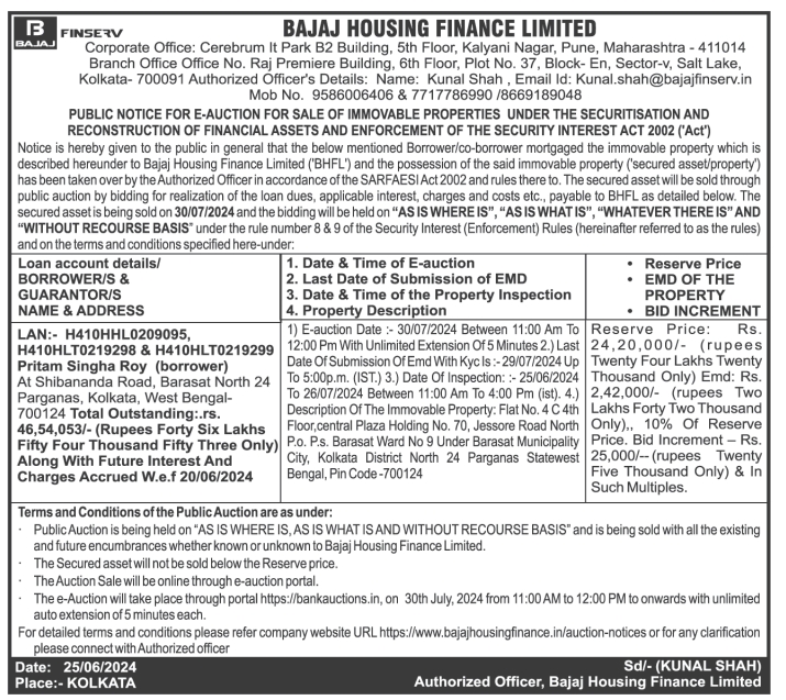 | Contact Details: | Contact The Authorized Officer's Details: Name: Kunal Shah Email Id: Kunal.shah@bajajfinserv.in Mob No. 9586006406 & 7717786990 /8669189048 |