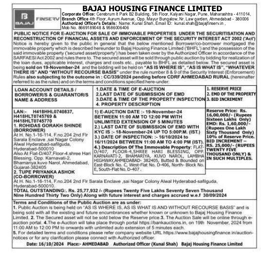 | Contact Details: | Contact The Authorized Officer: Kunal Shah, Email ID: kunalshah@bajaifinserv.in Mob No. 8669189048 & 9586006406 |