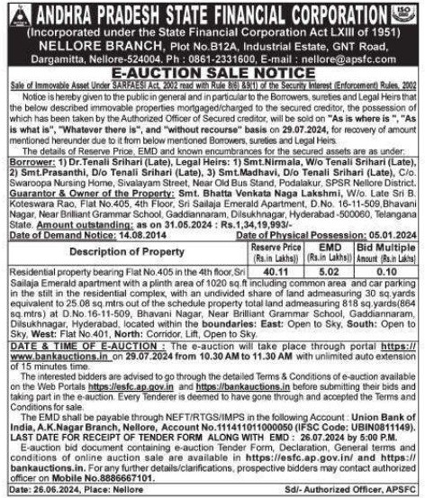 | Schedule of Property: | Residential property bearing Flat No. 405 in the 4th floor. Sri Sailaja Emerald apartment with a plinth area of 1020 SQ ft including common area and car parking in the stilt in the residential complex, with an undivided share of land admeasuring 30 sq yards equivalent to 25.08 sq mtrs out of the schedule property total land admeasuring 818 Sq.yards(864 sq mtrs) at D.No.16-11-509, Bhavani Nagar, Near Brilliant Grammar School, Gaddiannaram, Dilsukhnagar, Hyderabad located within the boundaries: East: Open to Sky. South: Open to Sky. West: Flat No 401, North: Corridor Lift. Open to Sky. |
