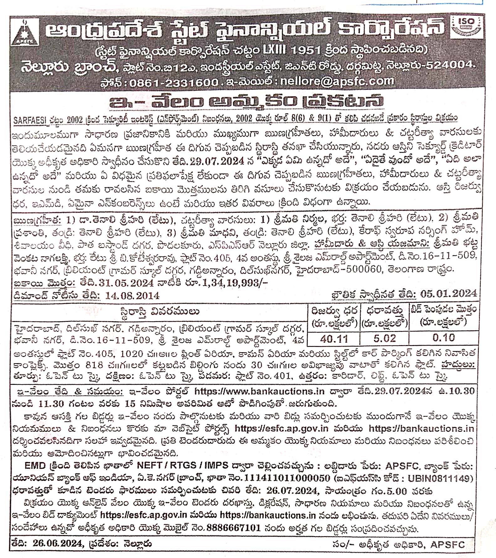 | Inspection Details: | For Inspection : Contact The Authorized Officer ; Ph 0861-2331600, E-mail: nellore@apsfc.com 8886667101. |