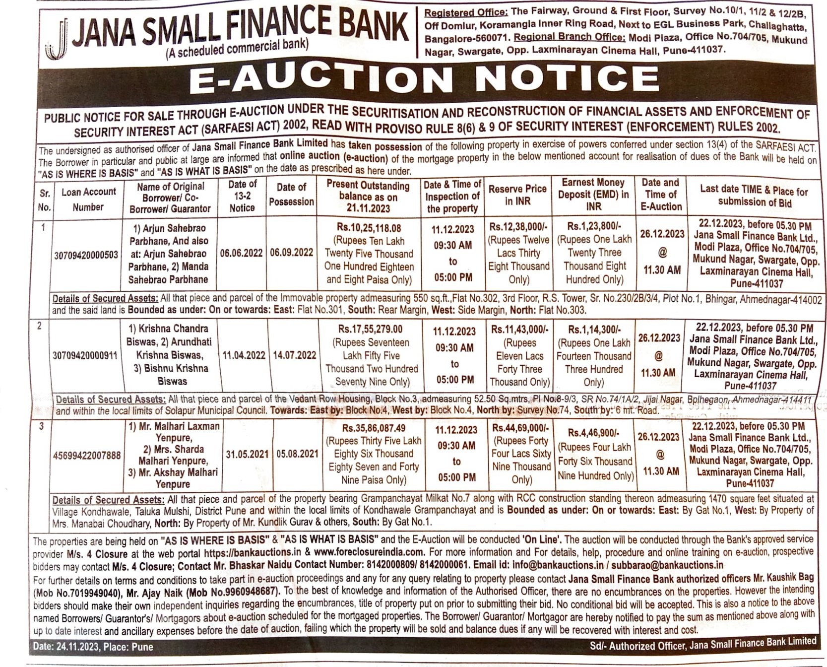 | Contact Details: | Contact Authorized Officer : Mr. Kaushik Bag 7019949040 , Mr. Ajay Naik 9960948687 , Mr. Ranjan Naik 9590858249 , Mr. Umesh 8050149617 , Mrs. Syeda 7400445147 |