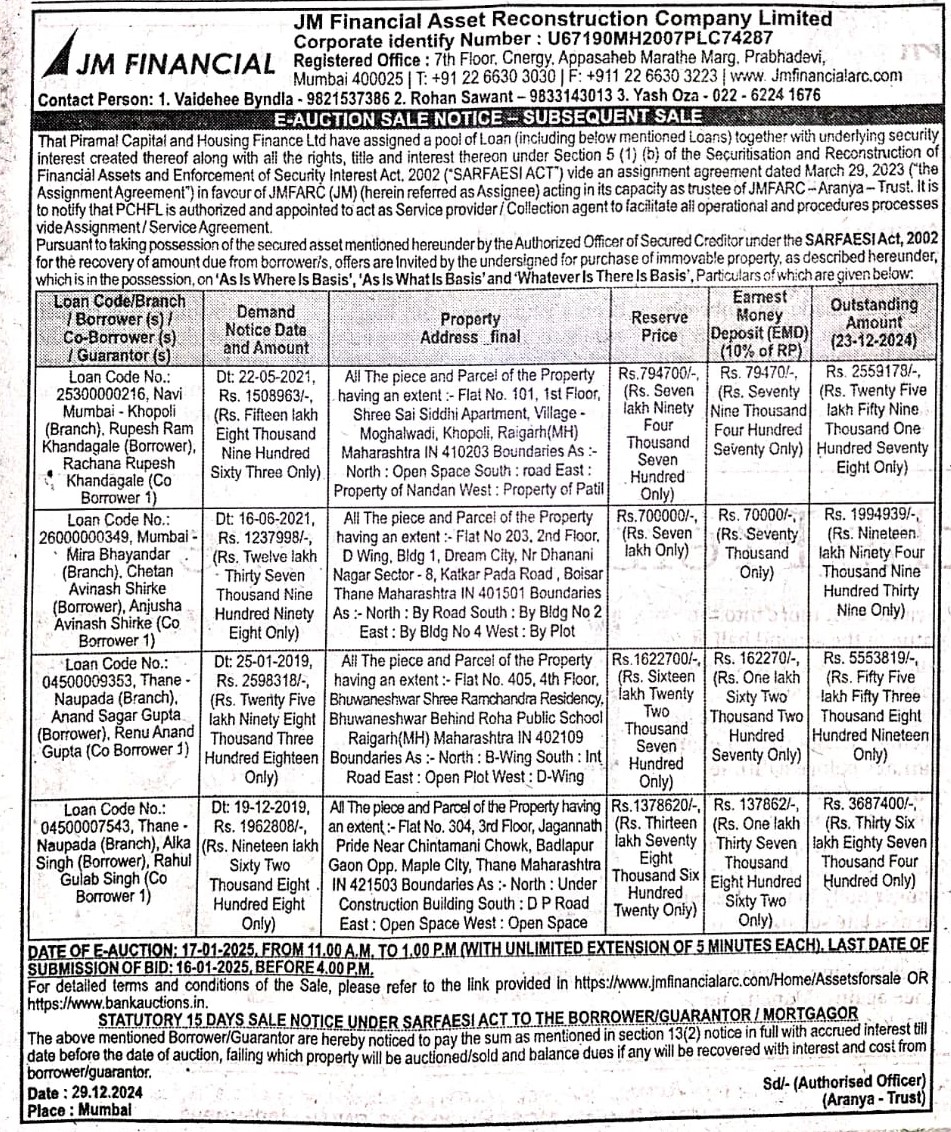 | Contact Details: | Contact The Authorized Officer : Vaidehee Byndla 9821537386, Rohan Sawant - 9833143013, Yash Oza 022-62241676 |