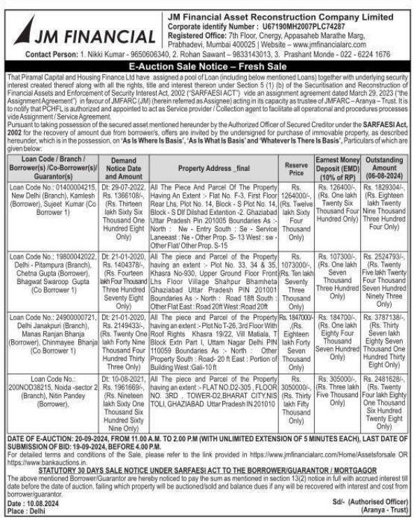 | Start Date and Time of Auction: | 20-09-2024 11:00 am |