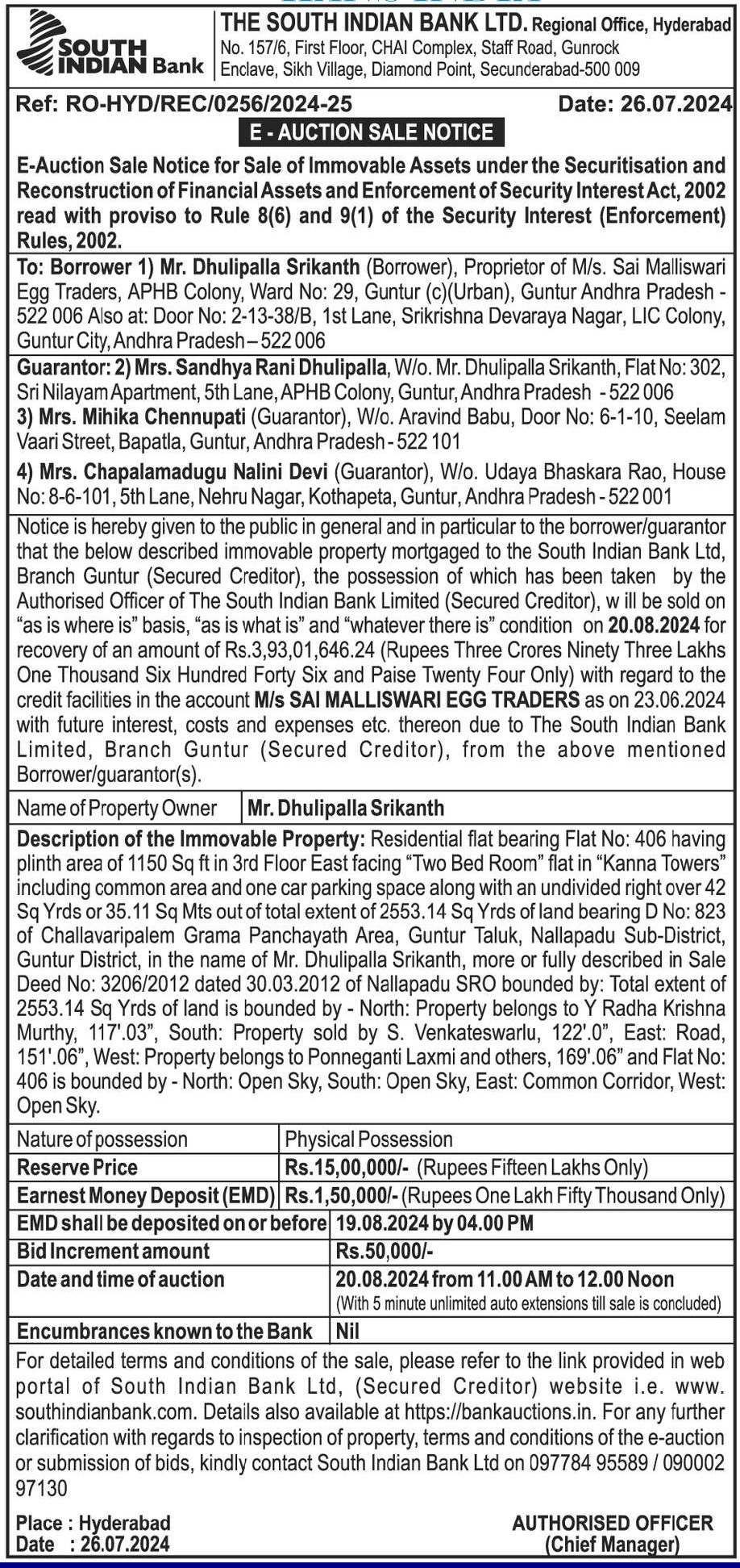 | Schedule of Property: | Residential flat bearing Flat No: 406 having plinth area of 1150 Sq ft in 3rd Floor East facing "Two Bed Room" flat in "Kanna Towers" including common area and one car parking space along with an undivided right over 42 Sq Yrds or 35.11 Sq Mts out of total extent of 2553.14 Sq Yrds of land bearing D No: 823 of Challavaripalem Grama Panchayath Area, Guntur Taluk, Nallapadu Sub-District, Guntur District, in the name of Mr. Dhulipalla Srikanth, more or fully described in Sale Deed No: 3206/2012 dated 30.03.2012 of Nallapadu SRO bounded by: Total extent of 2553.14 Sq Yrds of land is bounded by - North: Property belongs to Y Radha Krishna Murthy, 117'.03", South: Property sold by S. Venkateswarlu, 122'.0", East: Road, 151'.06", West: Property belongs to Ponneganti Laxmi and others, 169'.06" and Flat No: 406 is bounded by - North: Open Sky, South: Open Sky, East: Common Corridor, West: Open Sky. |