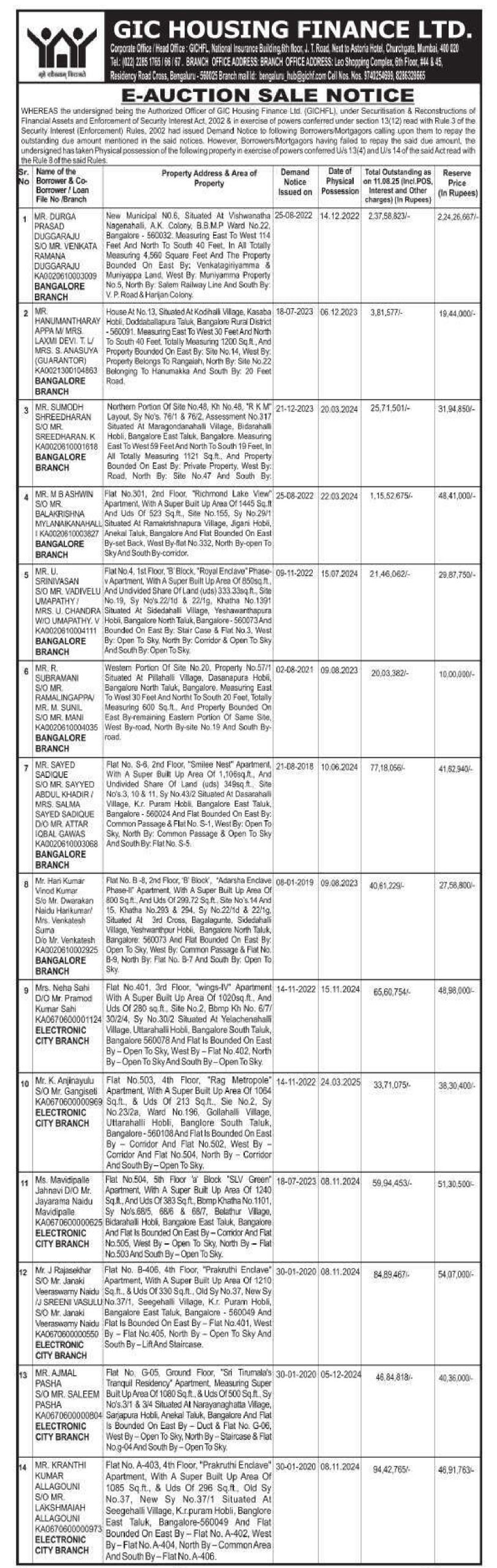 | Schedule of Property: | Flat No 301, 3rd Floor, B Wing, " Vivansaa Aurigaa" Apartment, With A Super Built Up Area Of 1212 Sq.ft., And Uds Of 443 Sq.ft., Sy No's. 36/6 & 36/7, Old Sy No. 36 Situated At Chambenahalli Village, Sarjapura Hobli, Anekal Taluk, Bangalore - 562125. And Flat Is Bounded On East By - Flat No. 302, West By - Flat No. 303 'a-wing', North By - Open To Sky & South By - Flat No. 305. |