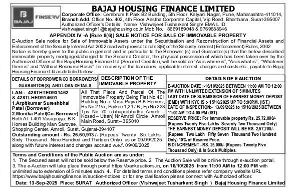 | Contact Details: | Contact The Authorized Officer : Name Vishwajeet Tusharkant Singh/ EMAIL ID: vishwajeet singh1@bajajhousing.co.in Mob No. 8669189048 & 9769688946 |