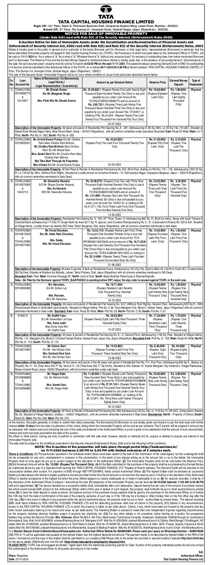 | Contact Details: | Contact The Authorized Officer : Manish Bansal, Email id Manish.Bansal@tatacapital.com , 8588983696 / 9999078669 |