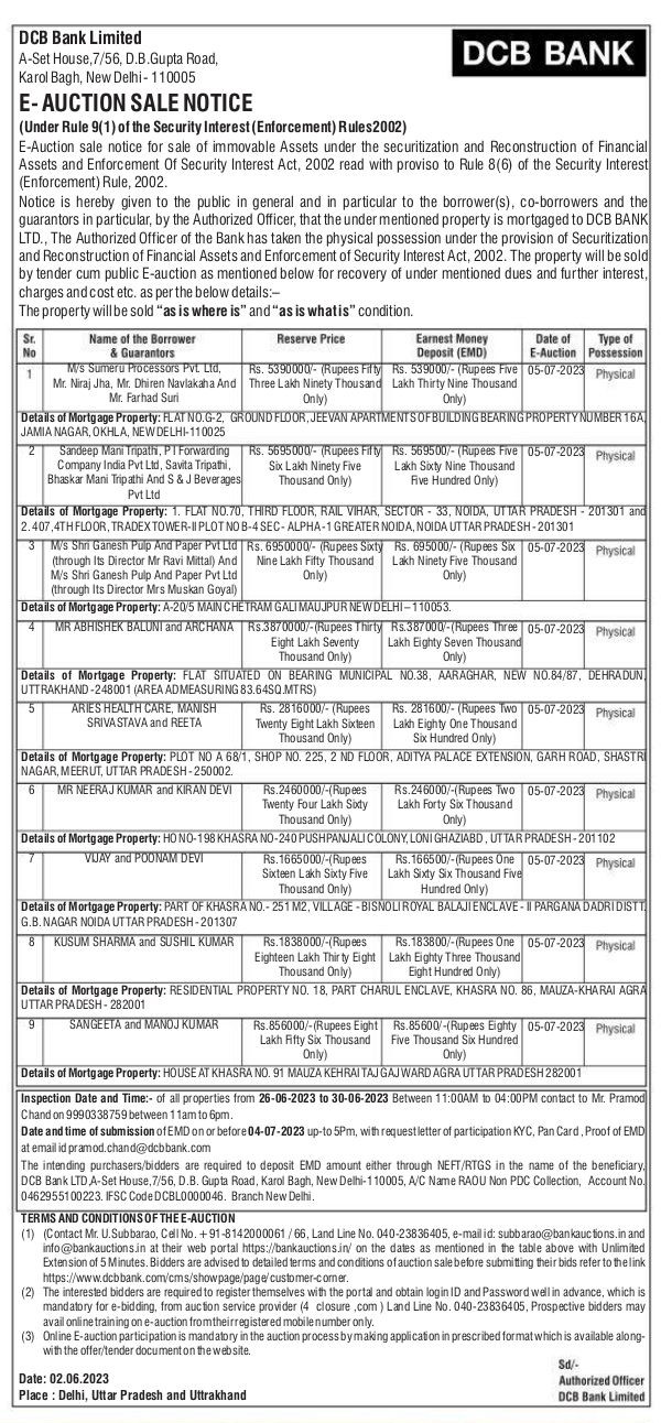 | Schedule of Property: | FLAT SITUATED ON BEARING MUNICIPAL NO.38. AARAGHAR NEW NO.84/87 DEHRADUN UTTRAKHAND-248001 (AREA ADMEASURING 83.64SQ MTRS) |