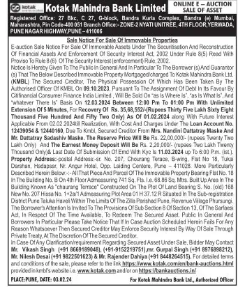 | Schedule of Property: | Described Herein Below All That Piece And Parcel of The immovable Property Bearing Flat No. 18 in The Building No. B On 4th Floor Admeasuring 741 Sq. Fts i e 68.86 Sq Mtrs Built Up Area In The Building Known As chaurang Terrace Constructed On The Plot Of Land Bearing S. No. (old) 168 New No. 207 Hissa No. 1+2a/1 Admeasuring Plot Area 01 H 37.12 R Situated In The Sub-registration District Pune Taluka Haveli Within The Limits Of The Zilla Parishad Pune, Revenue Village Phursungi