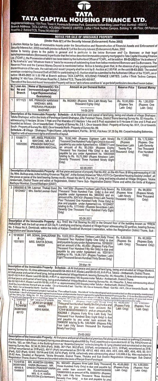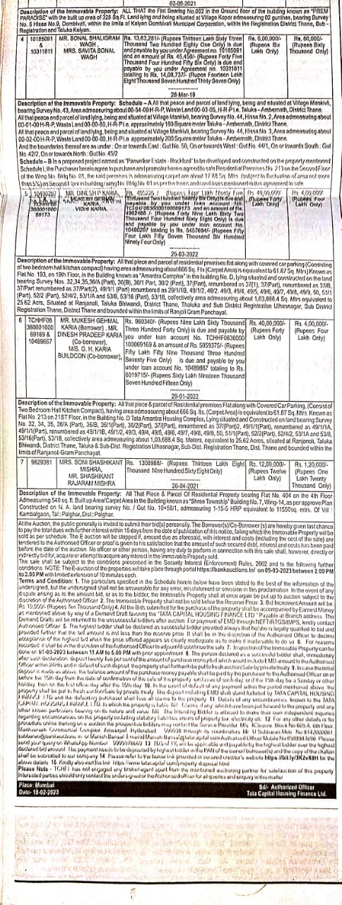 | Schedule of Property: | ALL That the Flat Bearing No.002 in the Ground floor of the building known as PREM PARADISE with the built up area of 325 Sq.Ft. Land lying and being situated at Village Kopar admeasuring 02 gunthas, bearing Survey No. 5 Hissa No.9, Dombivali, within the limits of Kalyan Dombivali Municipal Corporation, within the Registration District Thane, Sub - Registration and Taluka Kalyan.