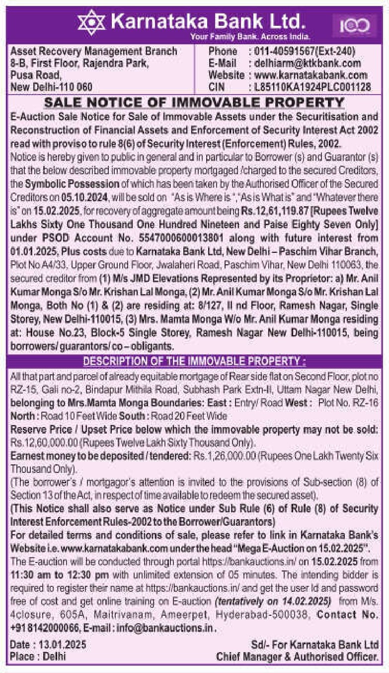 | Contact Details: | Contact the Authorized Officer : Asset Recovery Management Branch, Ph: 011-40591567 (Ext-240), E-mail: delhiarm@ktkbak.com |