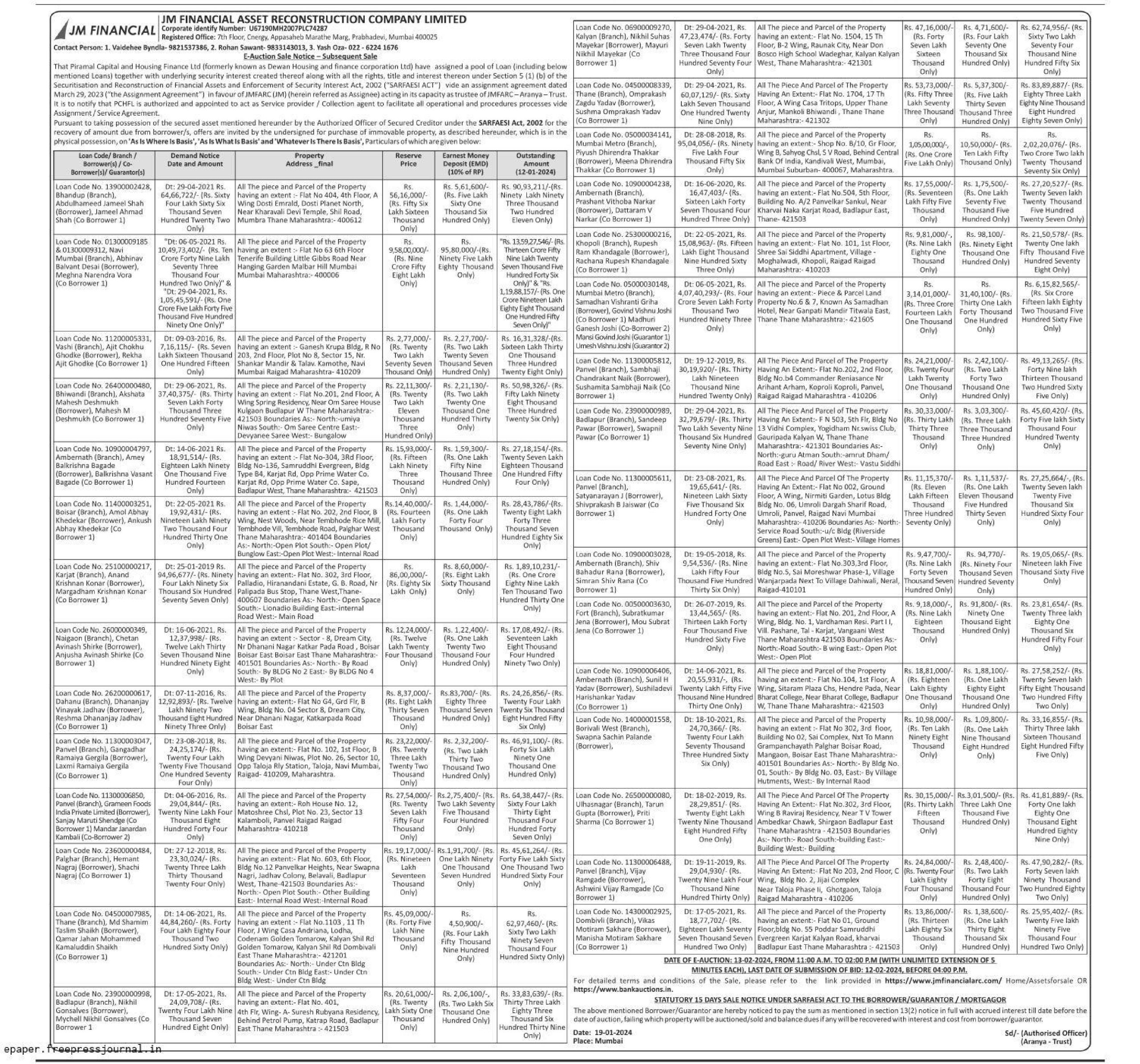 | Contact Details: | Contact Authorized Officer : 1. Vaidehee Byndla- 9821537386, 2. Rohan 9833143013, 3. Yash Oza- 022 6224 1676 |
