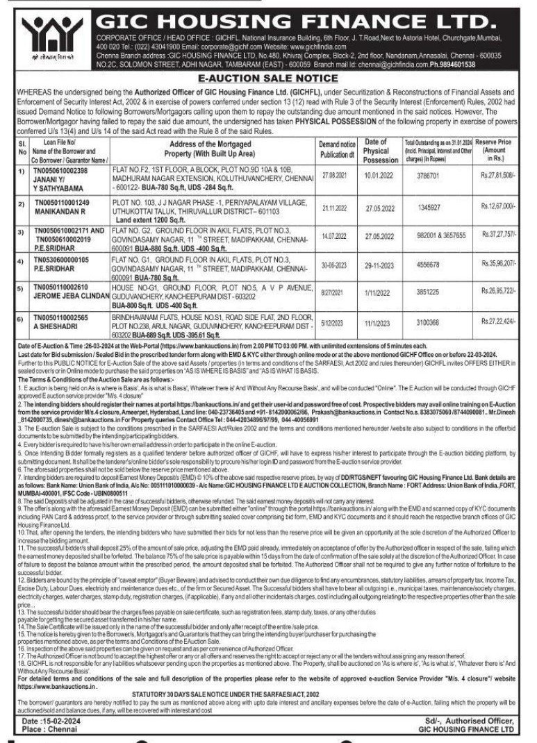 | Inspection Details: | For Inspection Contact No. 044-420348/96/97/99 044-40056991, mail Id: chennai@gichfindia.com 9894601538 |