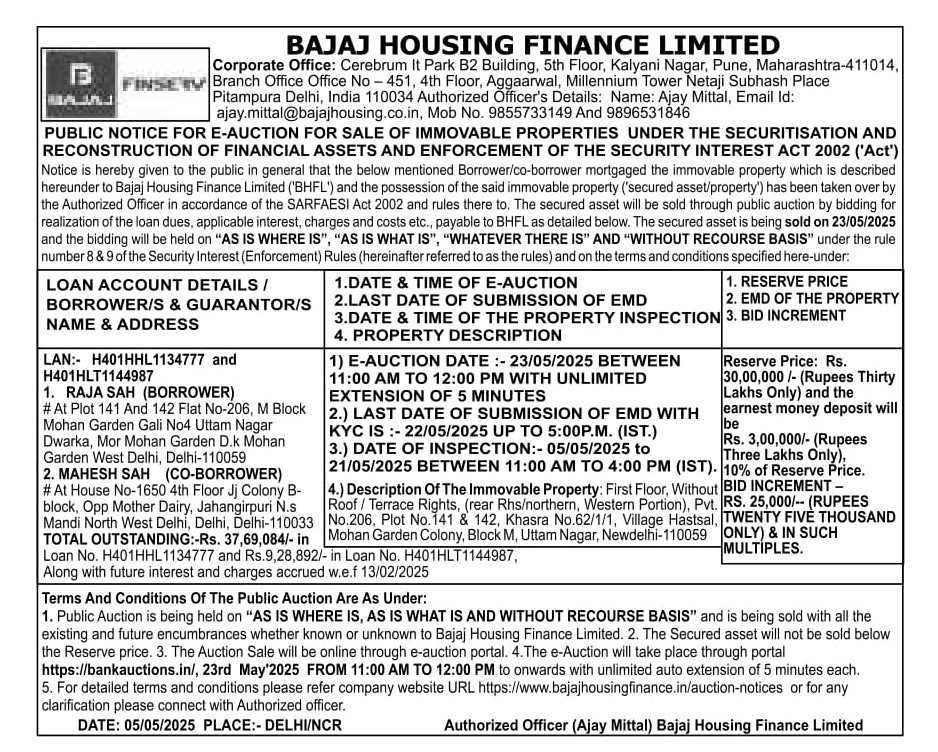 | Contact Details: | Contact The Authorized Officer: Ajay Mittal - 9855733149 And 9896531846, ajay.mittal@bajajhousing.co.in |
