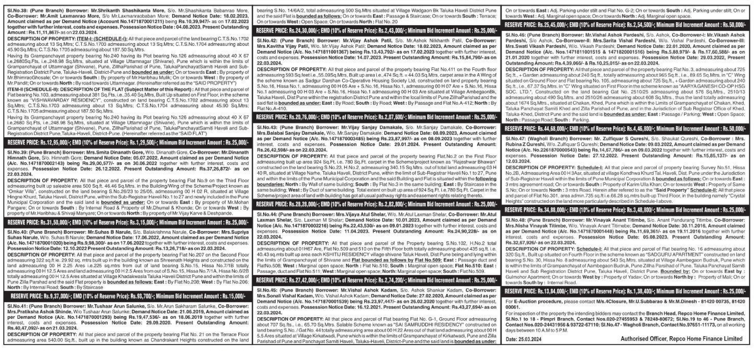 | Schedule of Property: | All that piece and parcel of the property bearing Flat No.207 on the Second Floor admeasuring 322 sq.ft ie. 29.92 sq. mtrs built up in the building known as Shreenath Heights and constructed on the land admeasuring 00 H 2.25 Ares ie.225 sq.mtrs from out of land bearing S.No.15, Hissa No.7/18 totally admeasuring 00 H 12.5 Ares and land admeasuring 00 H 2.5 Ares from out of S.No. 15, Hissa No. 7/1A, Hissa No.6/2B totally admeasuring 00 H 12.5 Ares situated at Village Khadakwasla Taluka Haveli District Pune and within the limits of Pune Zilla Parshad and the said Flat property is bounded as follows: East: By Flat No.208; West: By Flat No.206; North: By Internal Road, South: By Staircase |