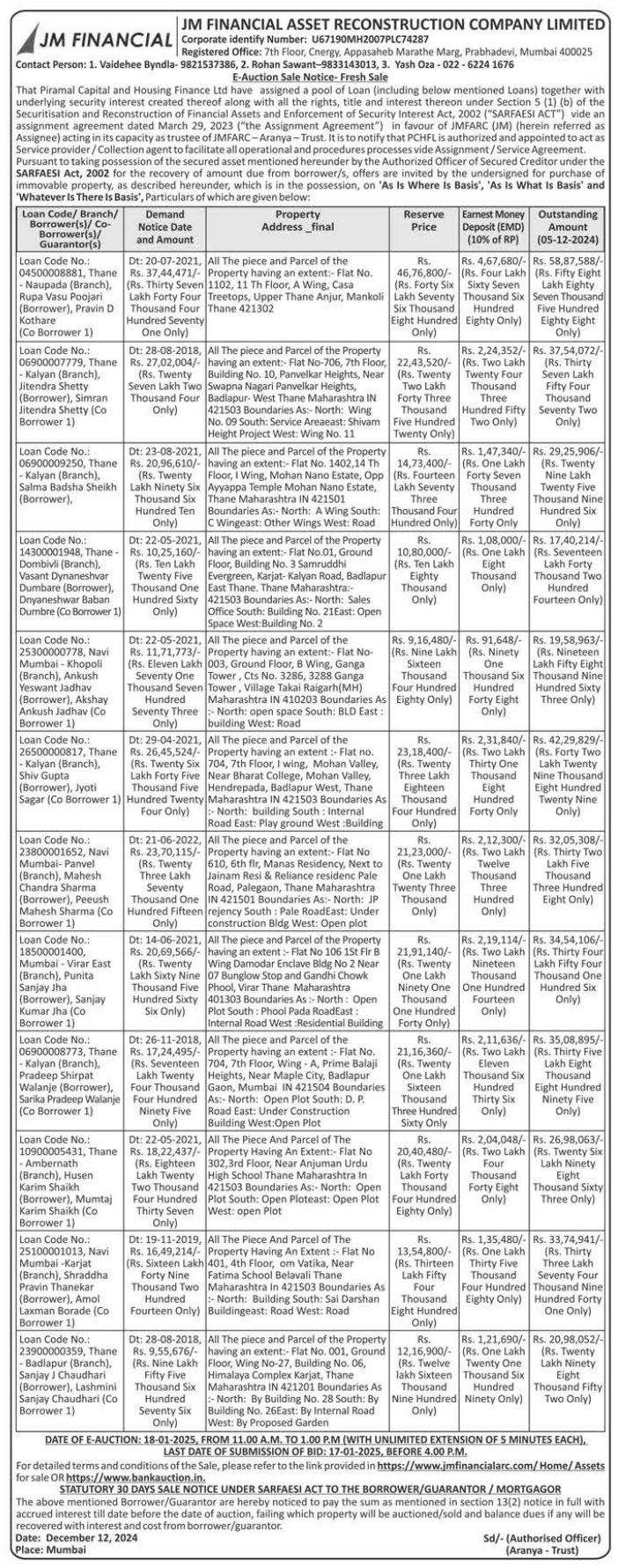 | Contact Details: | Contact The Authorized Officer: 1. Vaidehee Byndla- 9821537386, 2. Rohan Sawant-9833143013, 3. Yash Oza-022-62241676 |