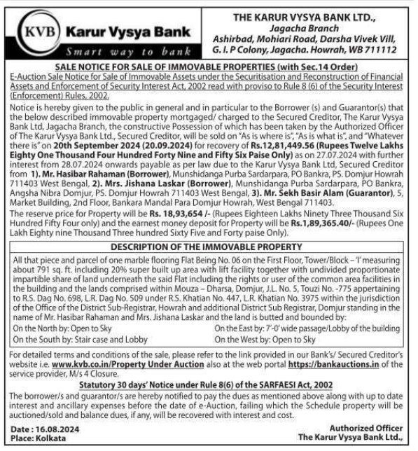 | Schedule of Property: | All that piece and parcel of one marble flooring Flat Being No. 06 on the First Floor, Tower/Block-'T' measuring about 791 sq. ft. including 20percentage super built up area with lift facility together with undivided proportionate impartible share of land underneath the said Flat including the rights or user of the common area facilities in the building and the lands comprised within Mouza - Dharsa, Domjur, J.L. No. 5, Touzi No. -775 appertaining to R.S. Dag No. 698, L.R. Dag No. 509 under R.S. Khatian No. 447, L.R. Khatian No. 3975 within the jurisdiction of the Office of the District Sub-Registrar, Howrah and additional District Sub Registrar, Domjur standing in the name of Mr. Hasibar Rahaman and Mrs. Jishana Laskar and the land is butted and bounded byOn the North by: Open to Sky On the East by: 7'-0' wide passage/Lobby of the buildingOn the South by: Stair case and LobbyOn the West by: Open to Sky |
