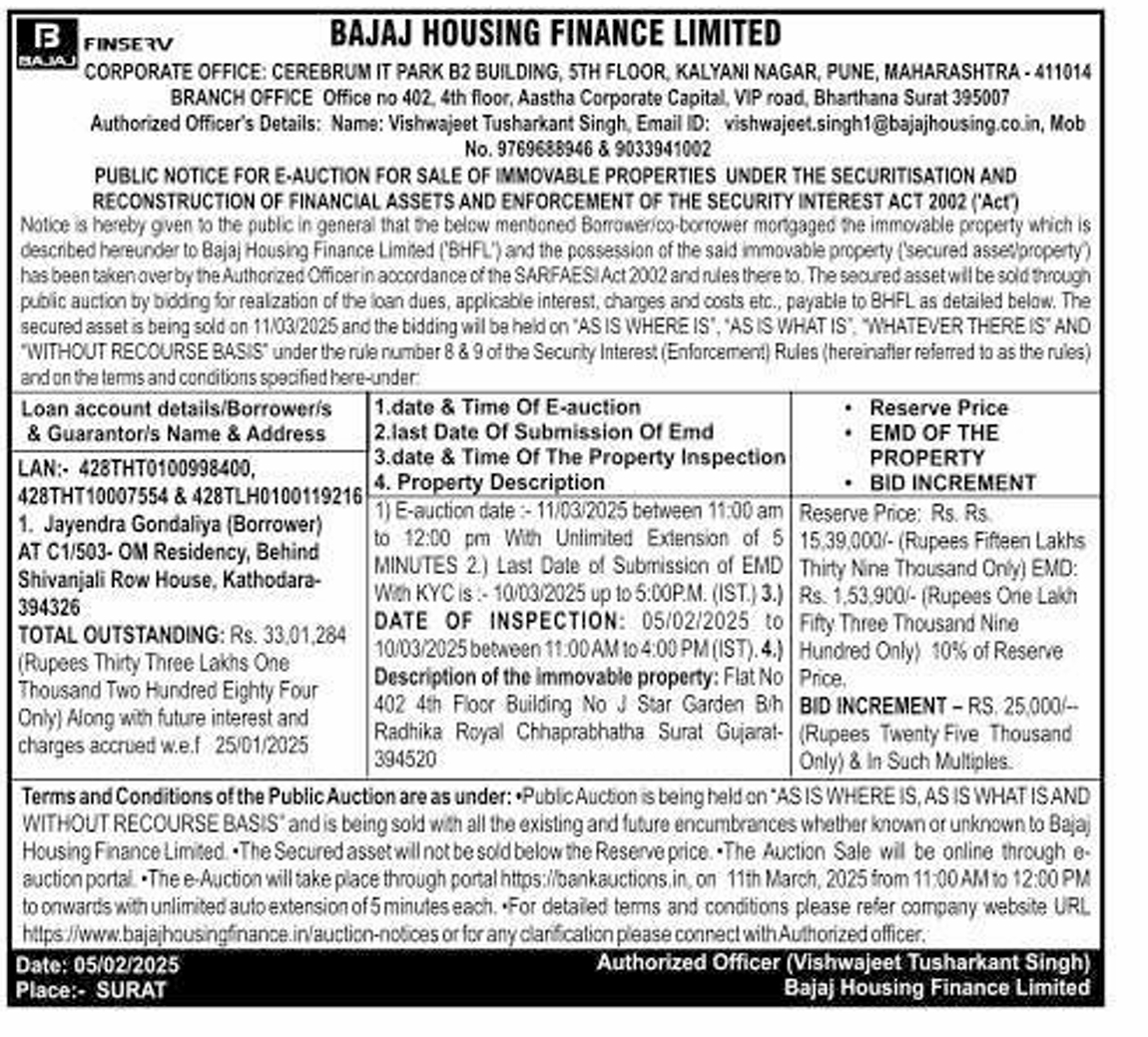 | Contact Details: | Contact The Authorized Officer: Vishwajeet Tusharkant Singh, Email ID: vishwajeet.singh1@bajajhousing.co.in, Mob No. 9769688946 & 9033941002 |