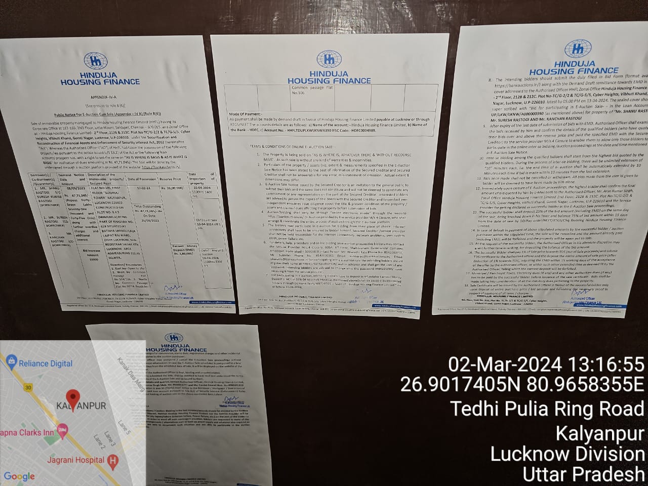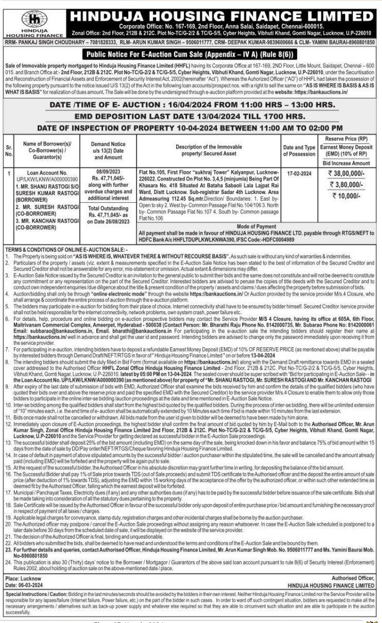 | Schedule of Property: | Flat No.105, First Floor sukhraj Tower Kalyanpur, Lucknow- 226022. Constructed On Plot No. 3,4,5 (minjumla) Being Part Of Khasara No. 418 Situated At Bataha Sabaoli Lala Lajpat Rai Ward, Distt Lucknow. Sub-registrar Sadar 4th Lucknow. Area Admeasuring 112.45 Sq.mtr.Direction/ Boundaries: 1. East by- Open to sky 2. West by-Common Passage Flat No. 104/106 3. North by-Common Passage Fiat No. 107 4. South by- Common passage Flat No. 106 |