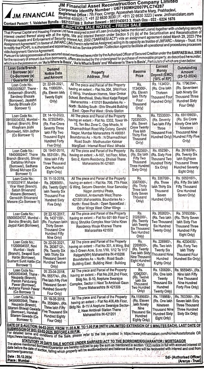 | Contact Details: | Contact The Authorized Officer: Vaidehee Byndla 9821537386, Rohan Sawant-9833143013, Yash Oza-022-62241676 |