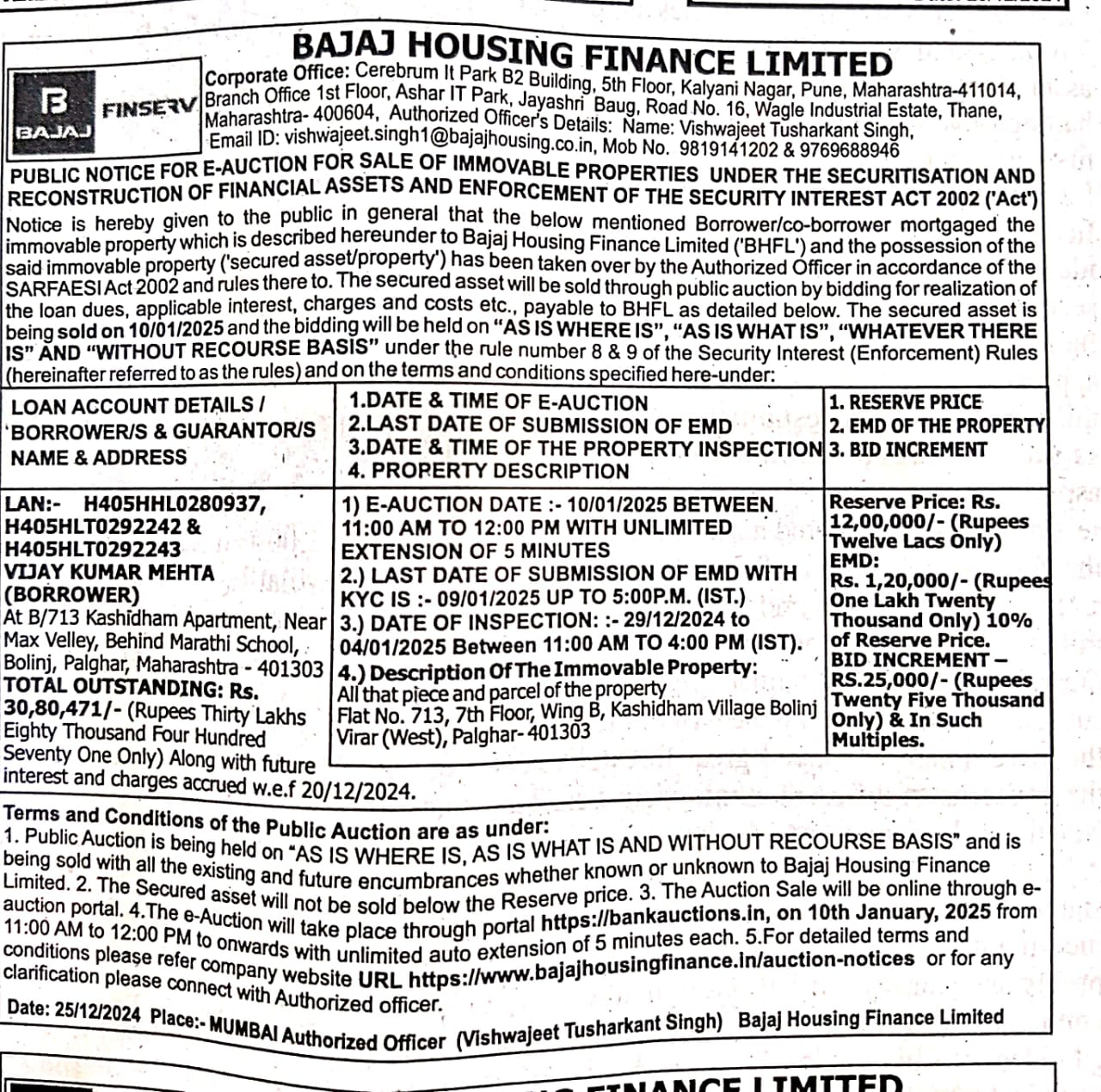 | Schedule of Property: | 4.) Description Of The Immovable Property:All that piece and parcel of the property Flat No. 713, 7th Floor, Wing B, Kashidham Village Bolinj Virar (West), Palghar-401303 |