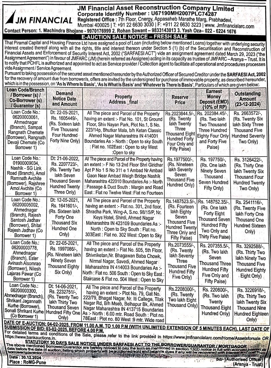 | Contact Details: | Contact The Authorized Officer : Machindra Bhojane 9970176999, Rohan Sawant - 9833143013, Yash Oza-6224 1676 |