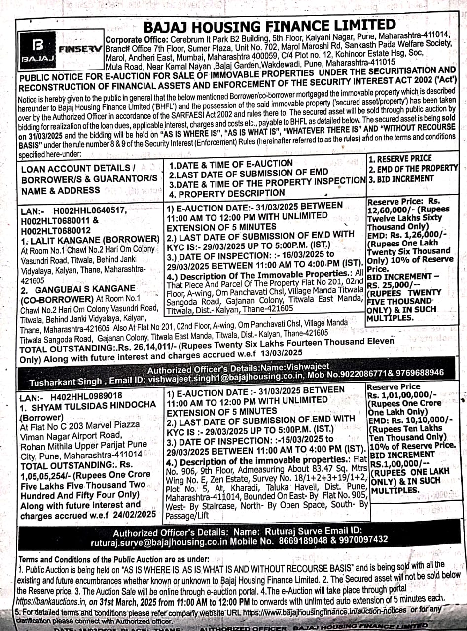 | Contact Details: | Contact The Authorized Officer: Ruturaj Surve - Email ID: ruturaj.surve@bajajhousing.co.in 8669189048 & 9970097432 |