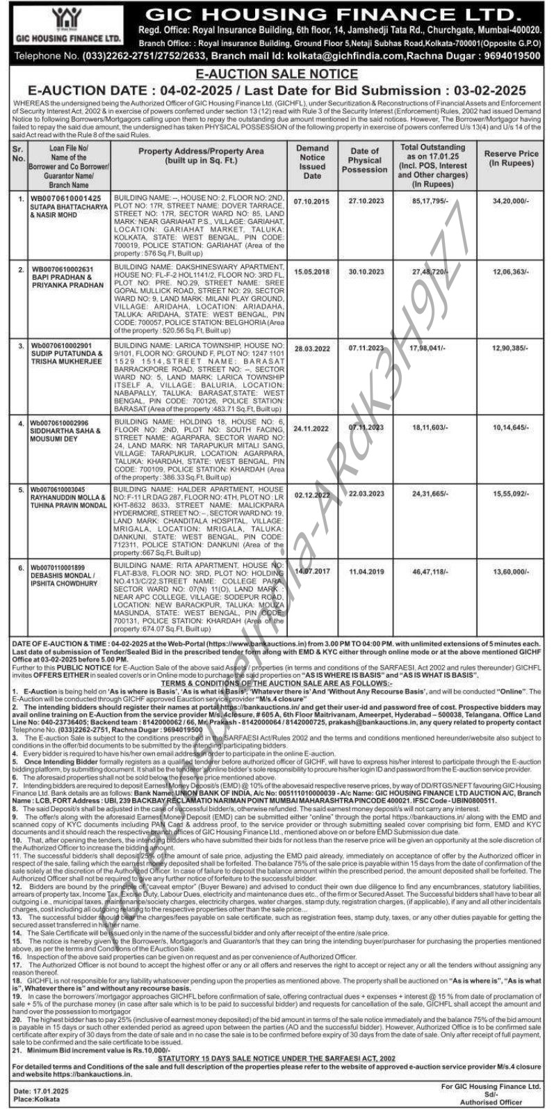 | Contact Details: | Contact the Authorized Officer : Telephone No. (033)2262-2751, Rachna Dugar: 9694019500. |