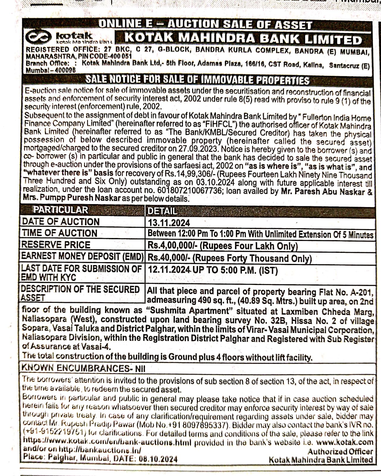 | Schedule of Property: | All that piece and parcel of property bearing Flat No. A-201, admeasuring 490 sq. ft., (40.89 Sq. Mtrs.) built up area, on 2nd floor of the building known as Sushmita Apartment situated at Laxmiben Chheda Marg, Nallasopara (West), constructed upon land bearing survey No. 32B, Hissa No. 2 of Village Sopara, Vasai Taluka and District Palghar, within the limits of Virar-Vasai Municipal Corporation, village Nallasopara Division, within the Registration District Palghar and Registered with Sub Register of Assurance at Vasai-4. The Total Construction of the Building id Ground Plus 4 floors without lift Facility |