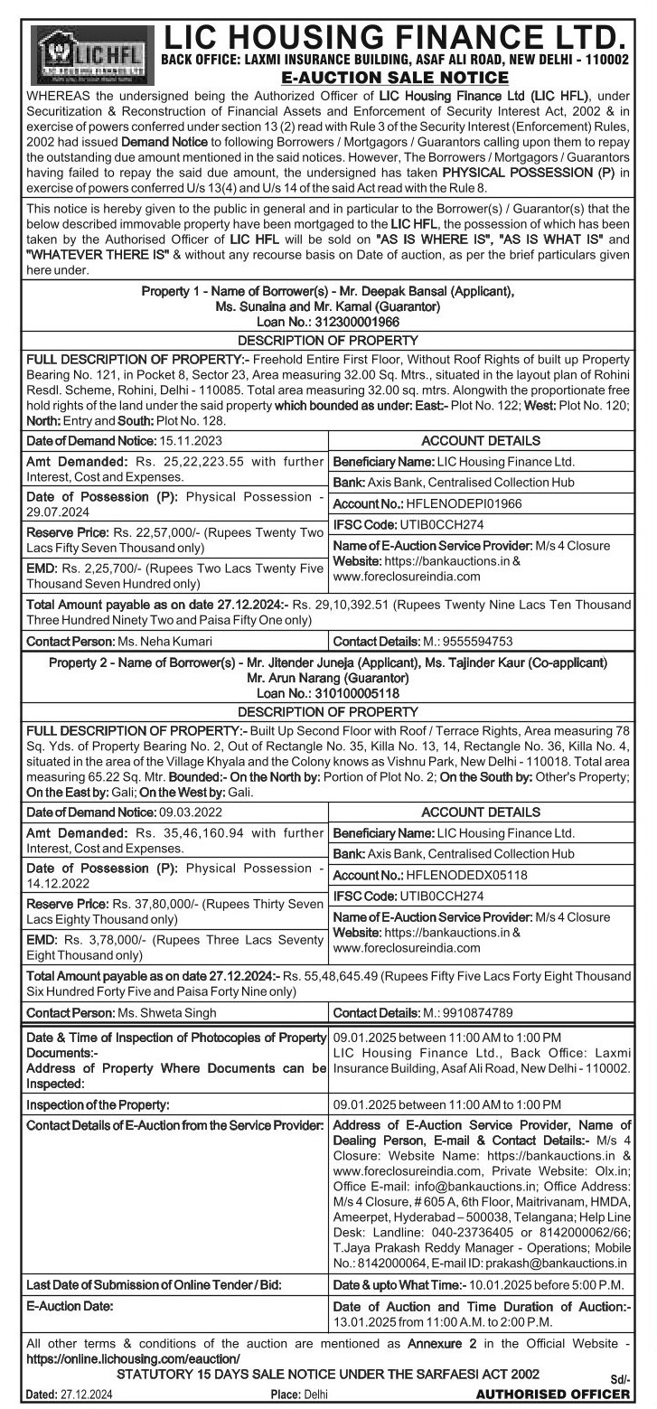 | End Date and Time of Auction: | 13-01-2025 2:00 pm |
