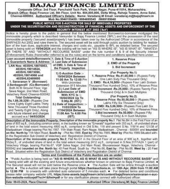 | Contact Details: | Contact The Branch Office:Authorized Officer's Details: Name: Varadaraj M Email :varadaraj.m@bajajfinserv.in Mob No.9940155459, 9884695545, 8669189048 |