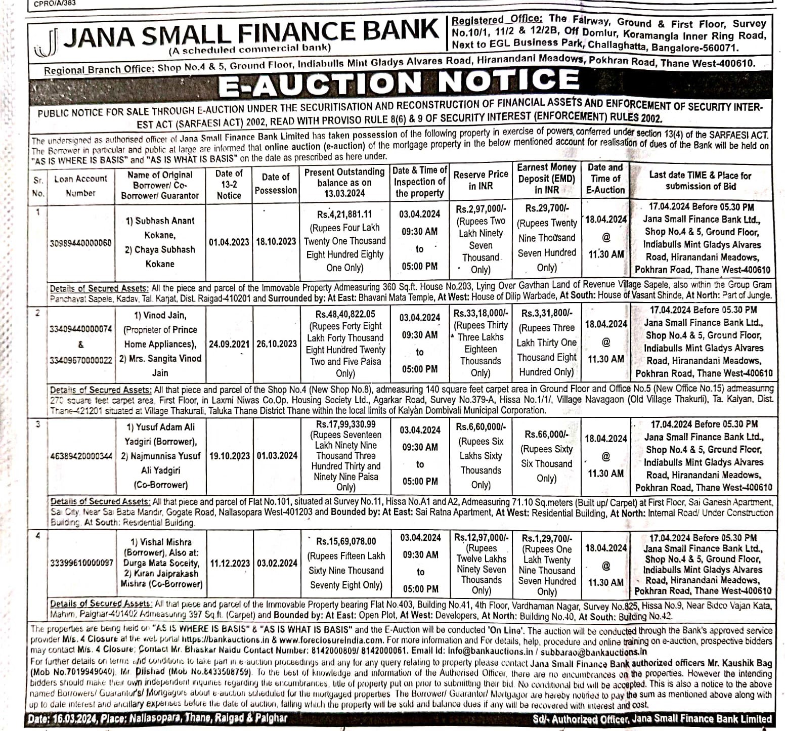 | Contact Details: | Contact Authorized Officer : Mr. Kaushik Bag Mob.No.:7019949040 , Mr. Dilshad Mob.No.:8433508759 |