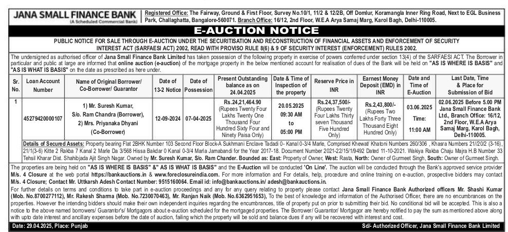 | Schedule of Property: | Property bearing Flat 2BHK Number 103 Second Floor Block-A Sukhmani Enclave Tadadi 0-Kanal 0-3/4 Marie, Comprised Khewat Khatoni Numbers 260/306, Khasra Numbers 21//20/2 (3-16), 21/1(3-6) Kitte 2 Rakba 7 Kanal 2 Marle Da 3/568 Hissa Bakdar 0 Kanal 0-3/4 Maria Jamabandi for the Year 2017-18. Document Number 2021-22/15/1/9492 Dated 11-10-2021. Wakiya Rakba Chaju Majra H.B Number 33 Tehsil Kharar Dist. Shahibjada Ajit Singh Nagar. Owned by Mr. Suresh Kumar, Sio. Ram Chander. Bounded as: East: Property of Owner, West: Rasta, North: Owner of Gurmeet Singh, South: Owner of Gurmeet Singh. |