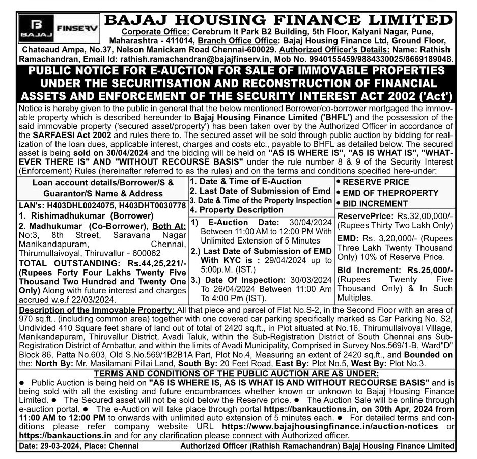 | Schedule of Property: | Description of the Immovable Property: All that piece and parcel of Flat No.S-2, in the Second Floor with an area of 970 sq.ft., (including common area) together with one covered car parking specifically marked as Car Parking No. S2, Undivided 410 Square feet share of land out of total of 2420 sq.ft., in Plot situated at No.16, Thirumullaivoyal Village, Manikandapuram, Thiruvallur District, Avadi Taluk, within the Sub-Registration District of South Chennai ans Sub- Registration District of Ambattur, and within the limits of Avadi Municipality, Comprised in Survey Nos.569/1-B, Ward"D" Block 86, Patta No.603, Old S.No.569/1B2B1A Part, Plot No.4, Measuring an extent of 2420 sq.ft., and Bounded on the: North By: Mr. Masilamani Pillai Land, South By: 20 Feet Road, East By: Plot No.5, West By: Plot No.3. |