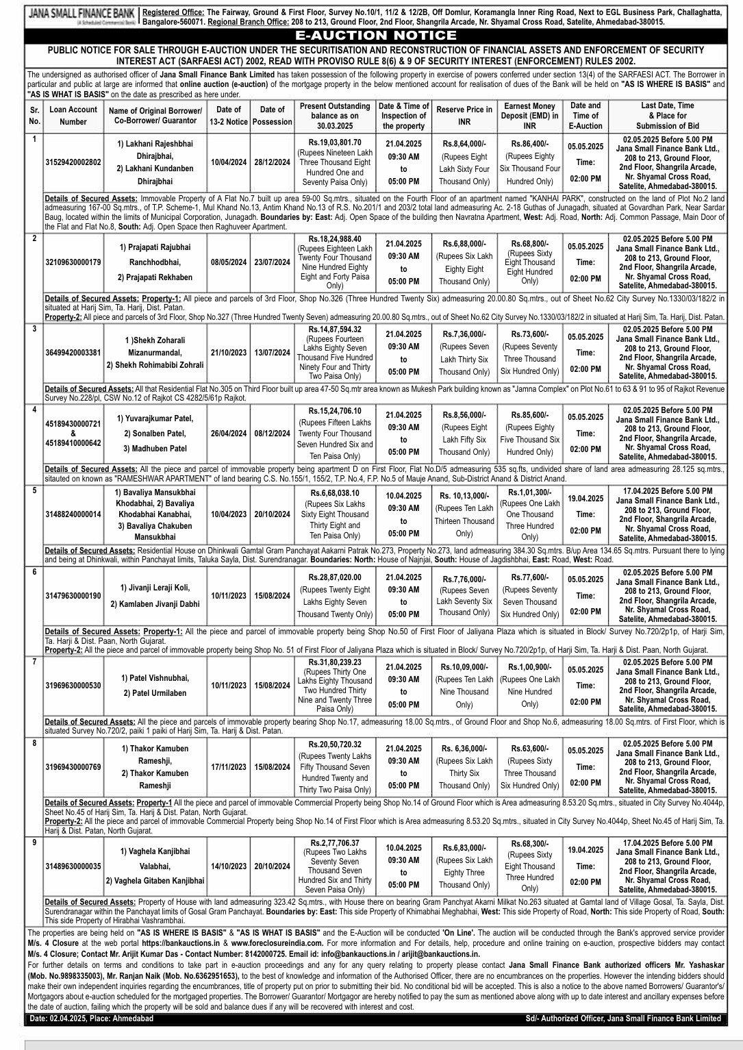 | Schedule of Property: | Details of Secured Assets: All the piece and parcel of immovable property being apartment D on First Floor, Flat No.D/5 admeasuring 535 sq.fts, undivided share of land area admeasuring 28.125 sq.mtrs., sitauted on known as RAMESHWAR APARTMENT of land bearing C.S. No. 155/1, 155/2, T.P. No.4, F.P. No.5 of Mauje Anand, Sub-District Anand & District Anand. |