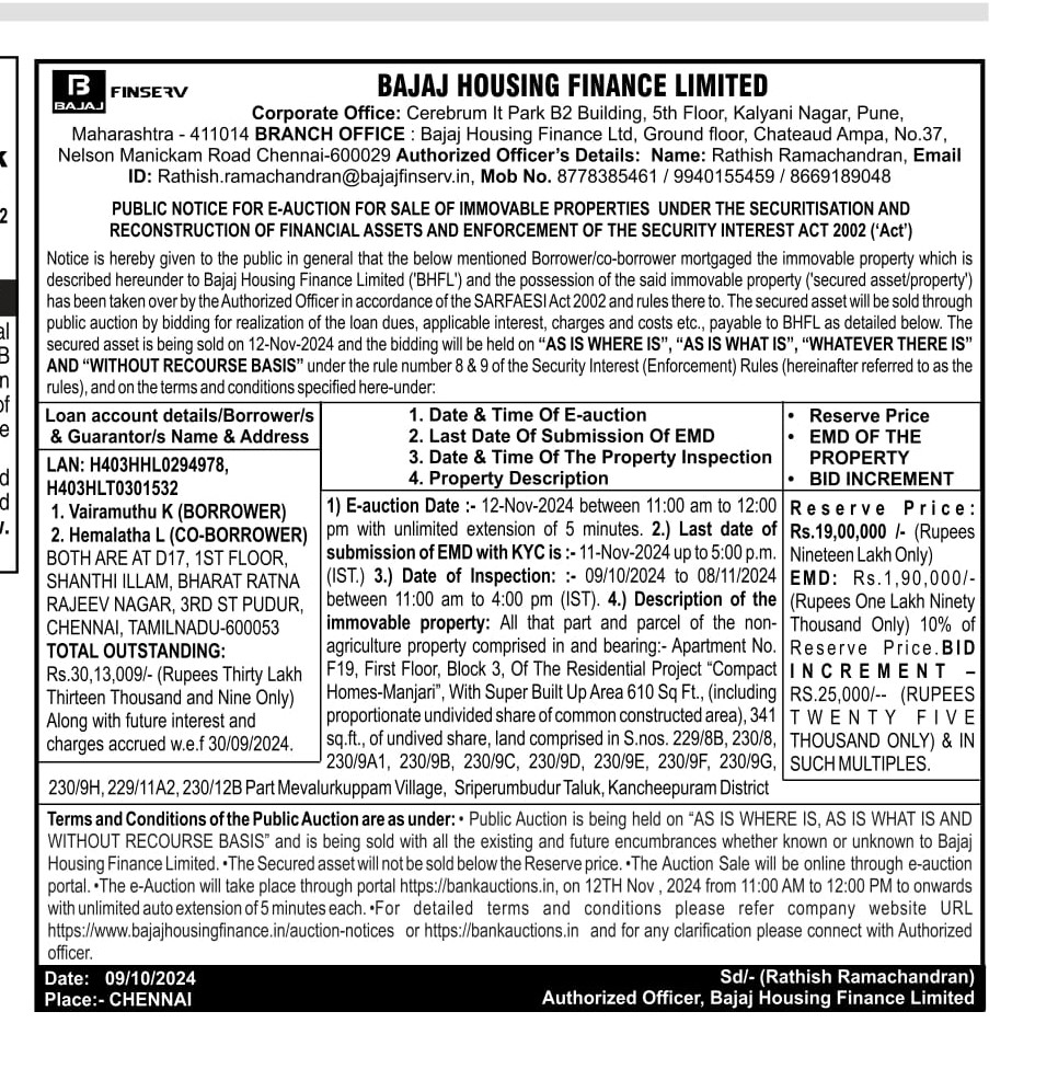 | Schedule of Property: | Description of the immovable property: All that part and parcel of the non- agriculture property comprised in and bearing:- Apartment No. F19, First Floor, Block 3, Of The Residential Project "Compact Homes-Manjari", With Super Built Up Area 610 Sq Ft., (including proportionate undivided share of common constructed area), 341 sq.ft., of undived share, land comprised in S.nos. 229/8B, 230/8, 230/9A1, 230/9B, 230/9C, 230/9D, 230/9E, 230/9F, 230/9G, 230/9H, 229/11A2, 230/12B Part Mevalurkuppam Village, Sriperumbudur Taluk, Kancheepuram District |