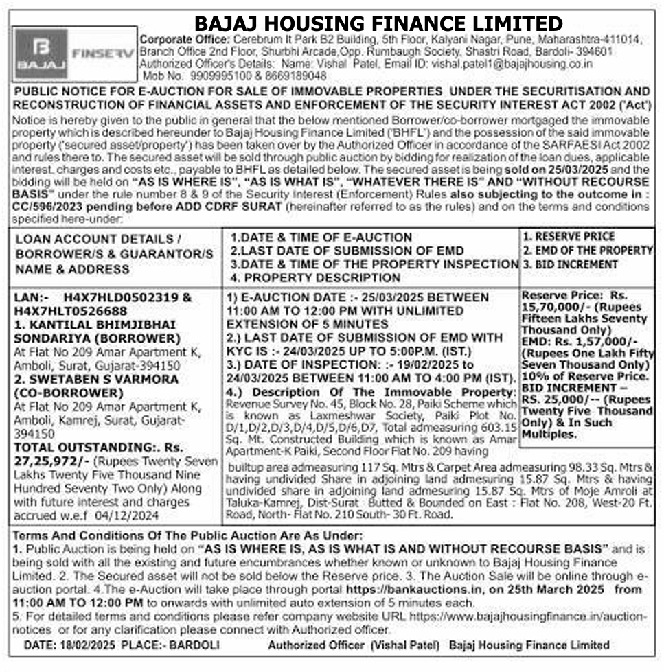 | Contact Details: | Contact The Authorized Officer: Vishal Patel. Email ID: vishal.patel1@bajajhousing.co.in Mob No. 9909995100 & 8669189048 |