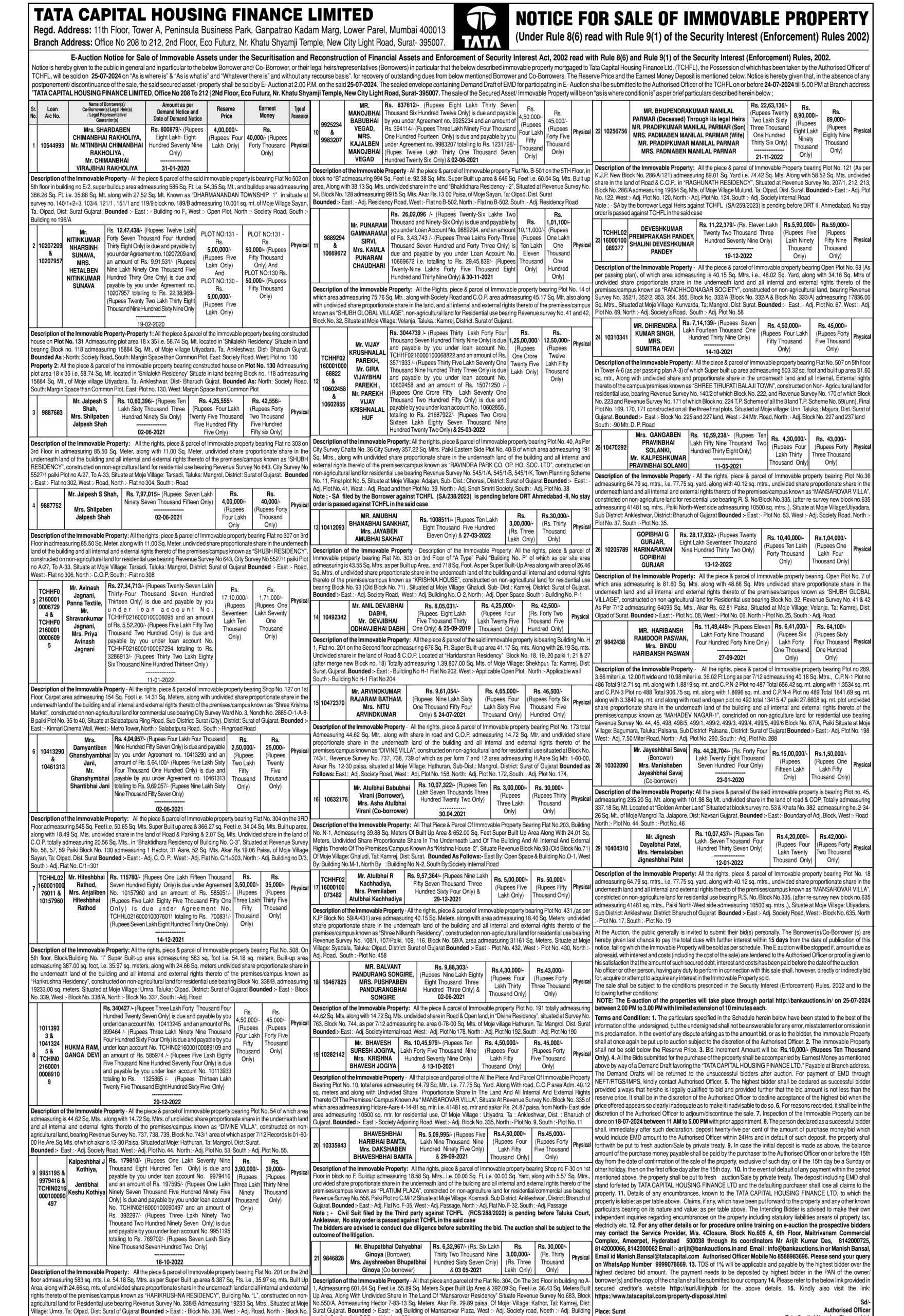 | Contact Details: | Contact The Authorized Officer: Manish Bansal - 8588983696, 9999078669, Email Id:Manish.Bansal@tatacapital.com |
