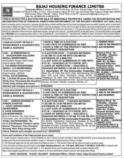 | Contact Details: | Contact the Authorized Officer: Name Vishal Patel, Email ID: vishal.patel1@bajajhousing.co.in Mob No. 9909995100 & 9909916781 |