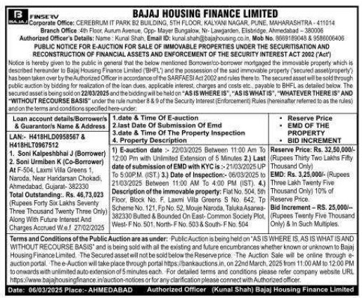 | Contact Details: | Contact The Authorized Officer: Kunal Shah, Email ID: kunal.shah@bajajhousing co.in, Mob No. 8669189048 & 9586006406 |