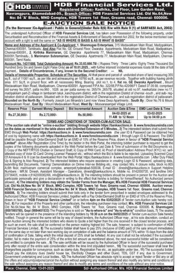| Contact Details: | Contact the Authorized Officer : K. Shanmugam (9597065780), Gopi (9884451533). |