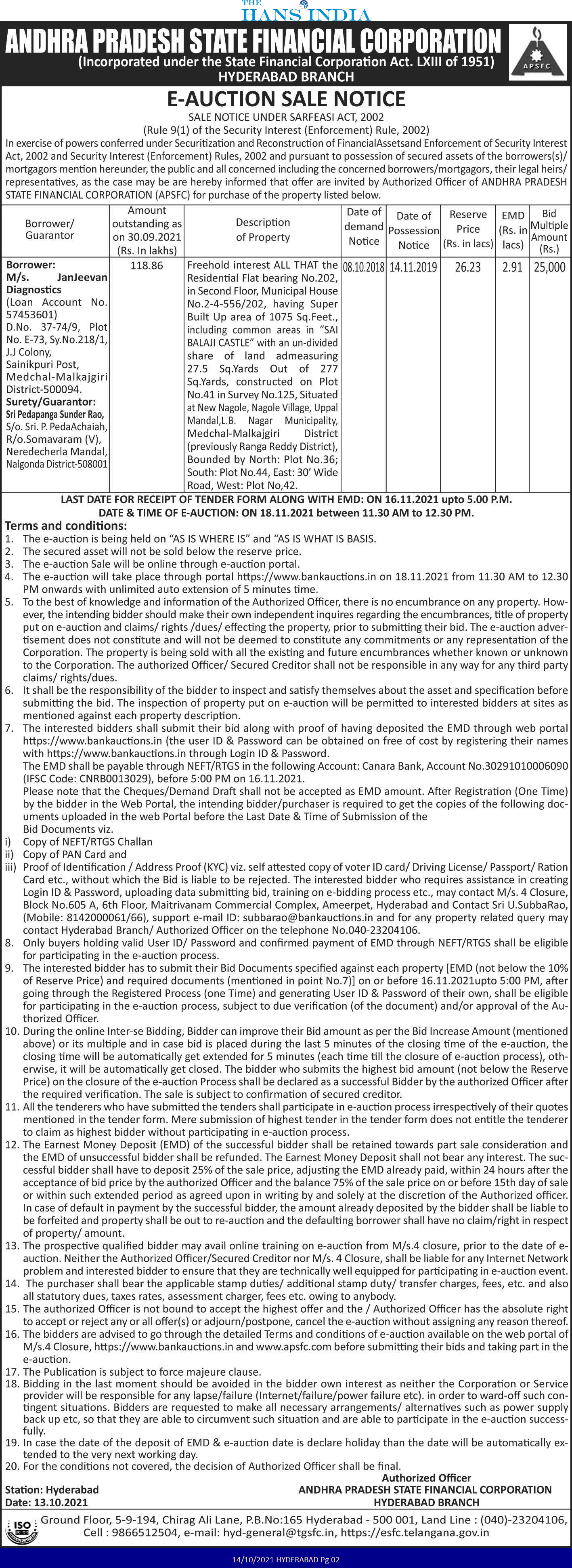 | Inspection Details: | For Inspection Details Please Contact The Authorized Officer, Phone No.040-23204106, Mobile No.9866512504 |