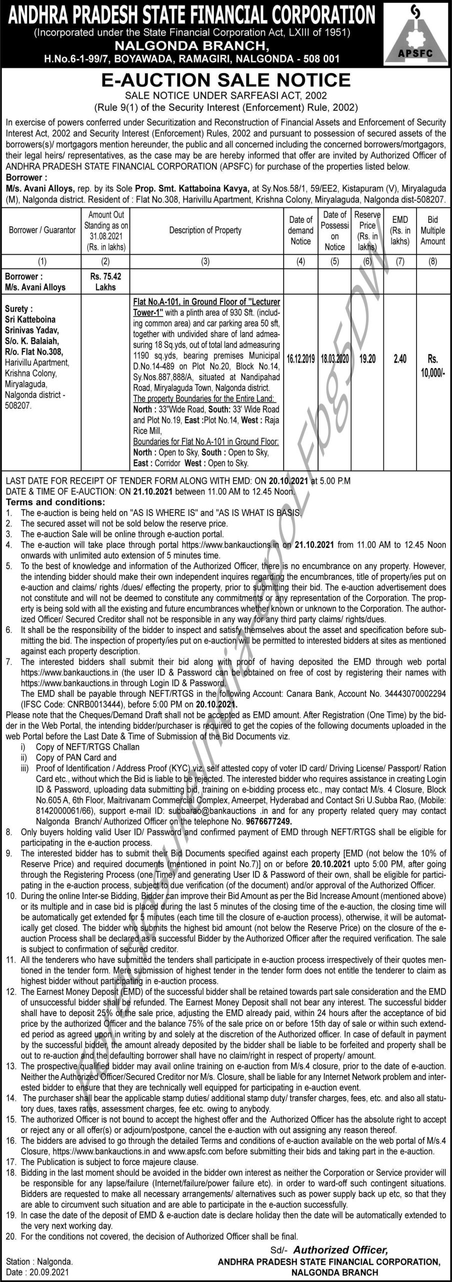 | Schedule of Property: | Flat No.A-101, in Ground Floor of 'Lecturer Tower-1' with a plinth area of 930 Sft. (including common area) and car parking area 50 sft, together with undivided share of land admeasuring 18 Sq.yds, out of total land admeasuring 1190 sq.yds, bearing premises Municipal D.No.14-489 on Plot No.20, Block No.14, Sy.Nos.887,888/A, situated at Nandipahad Road, Miryalaguda Town, Nalgonda District. The property Boundaries for the Entire Land North- 33' Wide Road, South- 33' Wide Road and Plot No.19. East- Plot No.14, West- Raja Rice Mill, Boundaries for Flat No.A-101 in Ground Floor, North- Open to Sky, South- Open to Sky, East- Corridor West- Open to Sky. |