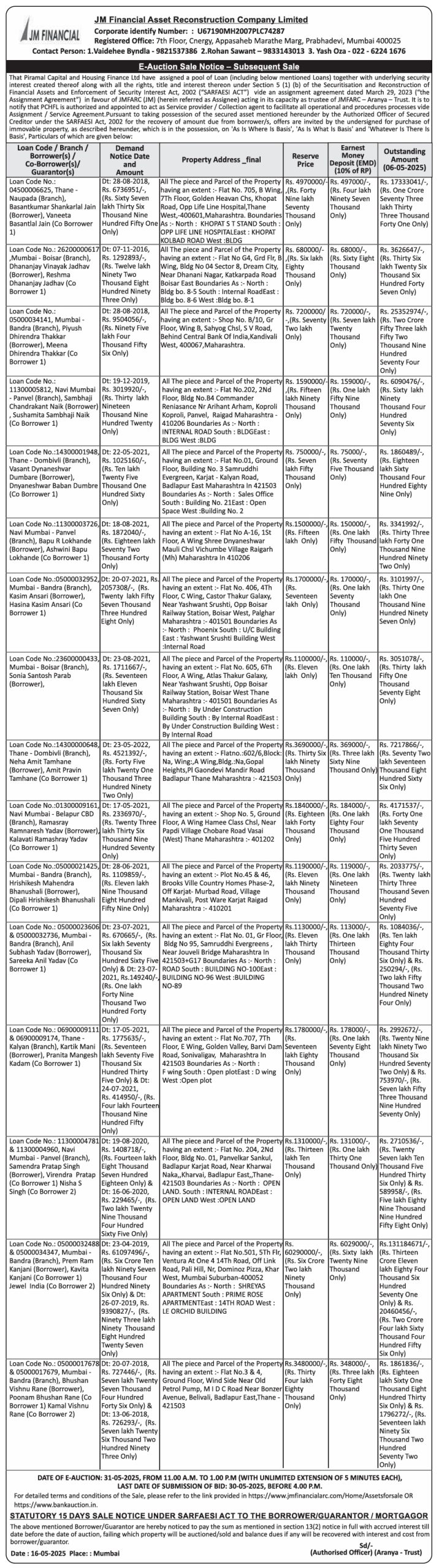 | Contact Details: | Contact The Authorized Officer : 1. Vaidehee Byndla - 9821537386 2.Rohan Sawant - 9833143013 3. Yash Oza - 022-6224 1676 |