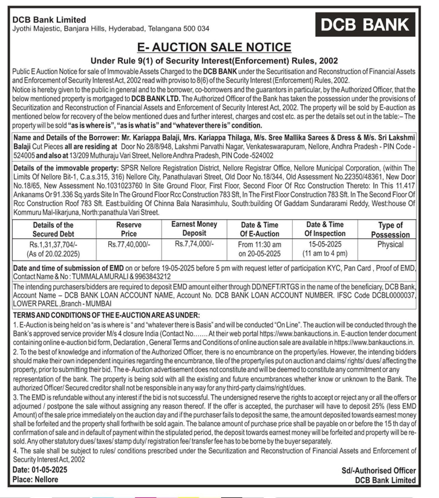 | Schedule of Property: | Details of the immovable property: SPSR Nellore Registration District, Nellore Registrar Office, Nellore Municipal Corporation, (within The Limits Of Nellore Bit-1, C.a.s.315, 316) Nellore City, Panathulavari Street, Old Door No. 18/344, Old Assessment No.22350/48361, New Door No. 18/65, New Assessment No. 1031023760 In Site Ground Floor, First Floor, Second Floor Of Rcc Construction Thereto: In This 11.417 Ankanams Or 91.336 Sq. yards Site In The Ground Floor Rcc Construction 783 Sft, In The First Floor Construction 783 Sft. In The Second Floor Of Rcc Construction Roof 783 Sft. East:building Of Chinna Bala Narasimhulu, South:building Of Gaddam Sundararami Reddy, West:house Of Kommuru Mal-likarjuna, North: panathula Vari Street. |
