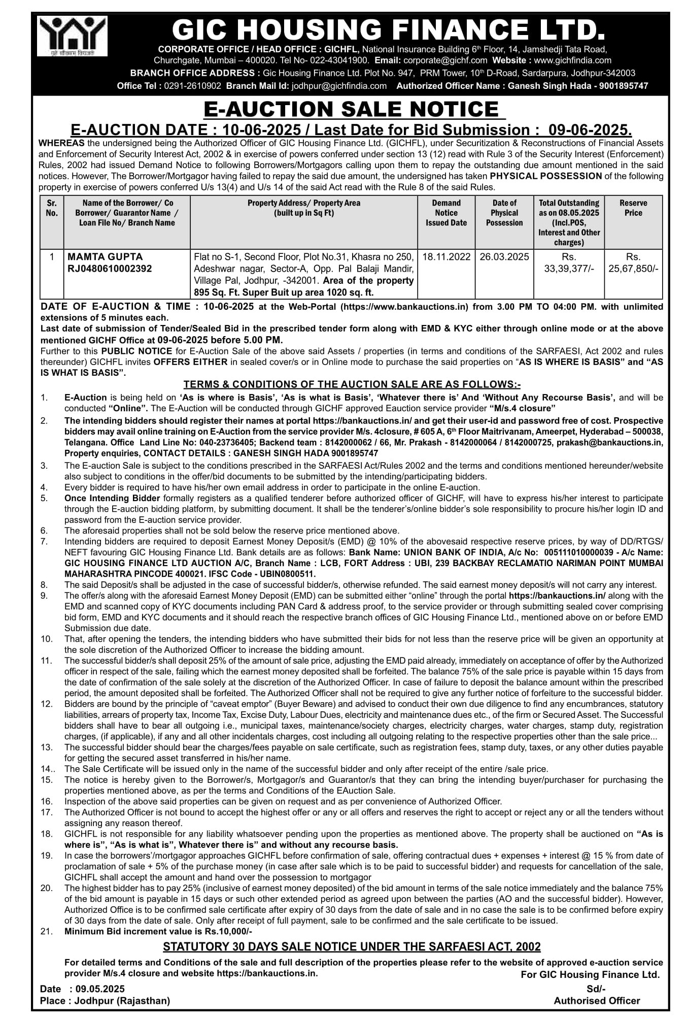 | Contact Details: | Contact The Authorized Officer : Ganesh Singh Hada - 9001895747, Mail Id: jodhpur@gichfindia.com |