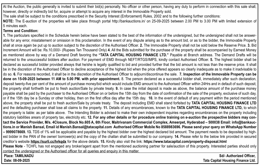 | End Date and Time of Auction: | 25-09-2025 3:00 pm |