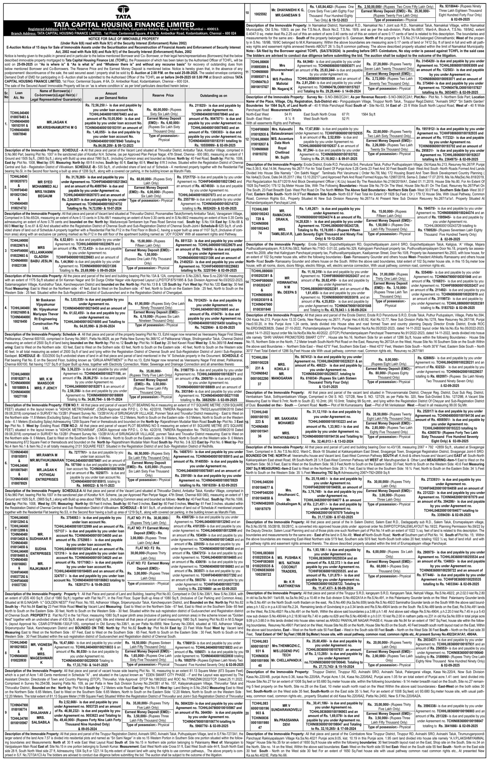 | Schedule of Property: | Schedule A: All that piece and parcel of the property bearing Plot No.13, Ezhil nagar now renamed as Veerasamy Nagar First Street, Pallikaranai, Chennai 600100, comprised in Survey No.366/1, Patta No.8629, as per Patta New Survey No.366/1C of Pallikaranai Village, Sholinganallur Taluk, Chennai District measuring an extent of 2500 Sq.ft of land being bounded on the: North by: Plot no.12 South by: Plot No.14 East by: 20 feet Kaveri Road West by: S.No.365/1B And measuring: East to West on the Northern side : 63 feet East to West on the Sothern side : 63 feet North to South on the Eastern side : 40 feet North to South on the Western side: 40 feet In all total measuring as extent of 2500 Sq.ft of land and lying within the Registration District of Chennai South and Sub-Registration District of Joint I Sub Registrar, Saidapet. Schedule B 533/2500 Sq.ft undivided share of land in all that piece and parcel of land mentioned in the A Schedule property in the Document.Schedule C Flat bearing Flat No. E on the Second Floor, building known as GIRIJA APARTMENT in Plot no.13, Ezhil Nagar now renamed as Veerasamy Nagar First street, Pallikaranai, Chennai 600100, flat having 1127 Sq.ft of Super Built up Area, together with Electricity Connection, Water, Sewerage and Drainage Connection and all amenities thereto |